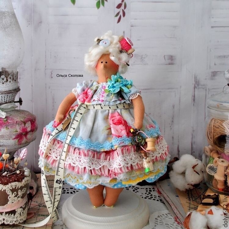 В теплом коконе мастерской, согретой светом абажура, оживает тряпичная кукла. Она словно вышла из сказки, где кружевные юбки хранят тайны старинных балов, а метрическая лента обвивает её, как след ухоженной садовой дорожки. Наивное лицо отражает мудрость веков, впитав не просто ткани, но и историю, шёпот дождя, бурю нитей и мечты мастериц. Ветер, заглянувший в окно, шевелит её розовый букет на шляпе. Всё вокруг — сплошное волшебство, вместившее украдённые у времени минутки тихой творческой радости. Каждый стежок — как отблеск детства, тёплого и родного, ожившего в этом крохотном мире. Нити, иглы, булавки, которые скрываются будто за весёлыми облаками, становятся кораблями, плывущими через моря фантазий.