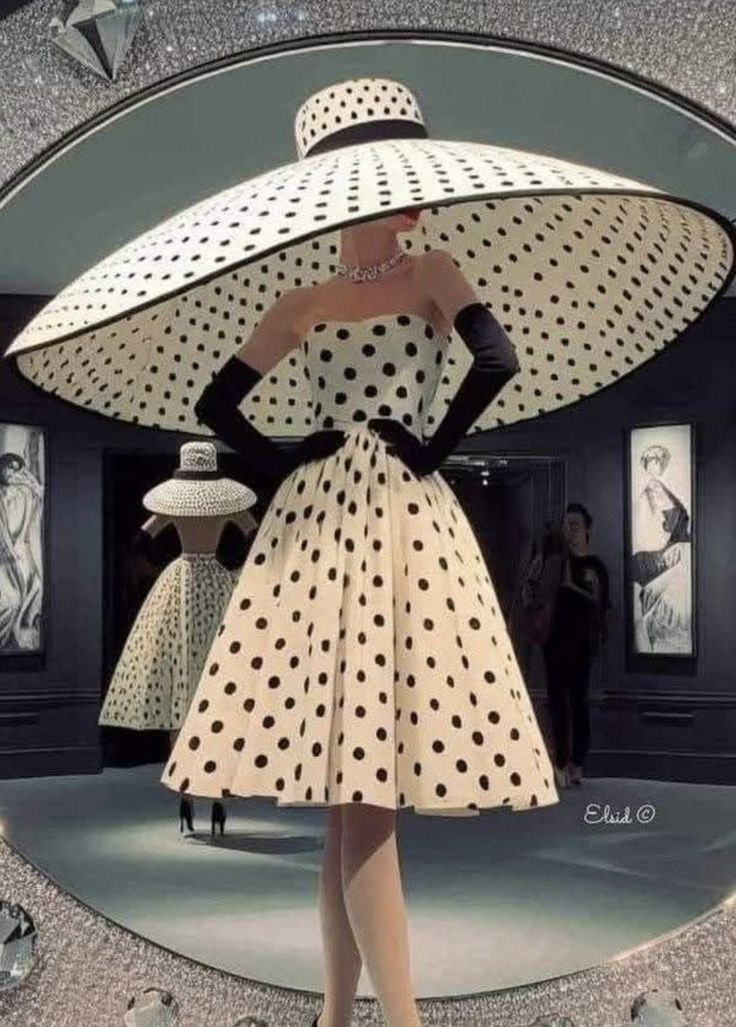 Величественное платье в горошек, с экстравагантной шляпой, словно вырезанное из сказки, увлекает в мир ретро-иллюзий. Оно как бы перемещает зрителя во времена, где изящество было высшей добродетелью. Шляпа больше напоминает шатёр, под которым укрылась героиня контрастного мира, отражённого в зеркалах, которых здесь видимо-невидимо. В погружающей глубине галереи угадываются линии и светотени иных времён, будто сюрреалистический танец форм, где каждая точка нашёптывает историю, невидимую глазу, но трогающую душу. Этим кадром художник, словно древний мастер, описывает целую вселенную утончённой элегантностью, где реальность и грёзы переплетаются, как нити на ткани. Платье — это не просто одежда, а целая симфония движения, захватывающая в свой вихрь безмолвных разговоров прошлого и андеграундной моды.