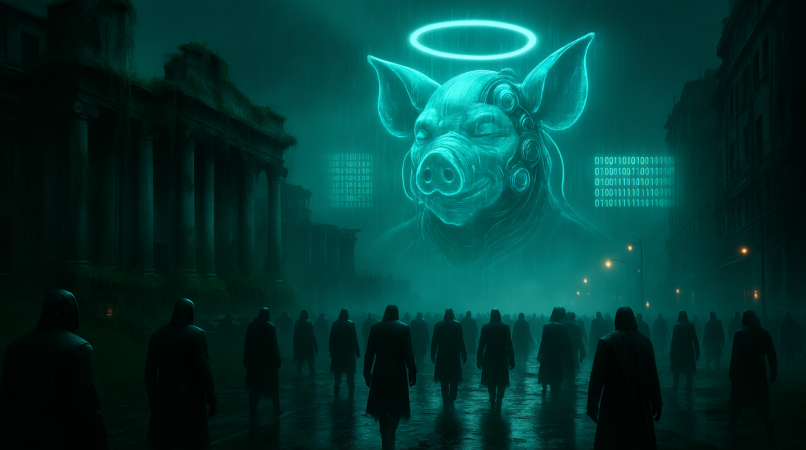 В тумане тёмного, почти антиутопического города, словно безмолвные тени, идут люди под мерцающими уличными огнями. Их шаги гулко отдаются в глубине пустого проспекта, опять и опять заставляя взгляд возвращаться к загадочному и почти мистическому изображению в небе. Неоновая свинья с киберпанковским ореолом, её восторженно насмешливые глаза, как будто говорят: "Мир, в котором мы живем, давно стал симфонией технологий, окружившей нас цифрами, что проникают в каждую трещину нашей повседневной жизни". Это колоссальное лицо словно портрет новой эры, где истинные и органичные слова кажутся утопией. Геометрия объемов, цифровые буквы, уносятся в бесконечность, подобно древнему тексту, написанному на языках, что забыты людьми, но не времени. Здания, как глядящие на нас призраки истории, склоняются в податливой покорности размытым светам, напоминая о разбитых мечтаниях. Подпись в углу – голос из прошлого или предостережение из будущего, её текст превратился в причудливую рябь надписи, как тень наплывающего прилива на песке. Каждая минута здесь – это встреча с эстетикой контраста, запечатленная в сознании со смесью иронии и восхищения.