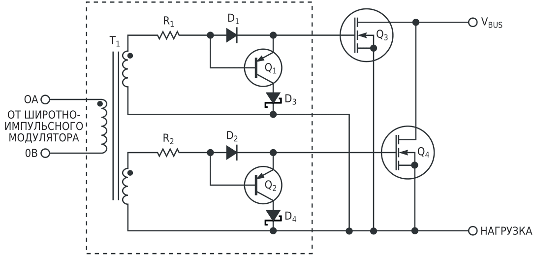 Драйвер верхнего плеча питает IGBT и MOSFET. Диоды Шоттки D3 и D4 предотвращают протекание тока через переходы коллектор-база транзисторов Q1 и Q2 при отрицательном сигнале управления. С помощью этой схемы можно получить времена переключения меньше 50 нс при включении и меньше 100 нс при выключении, в зависимости от выходного сопротивления источника управляющего сигнала, подаваемого на трансформатор.