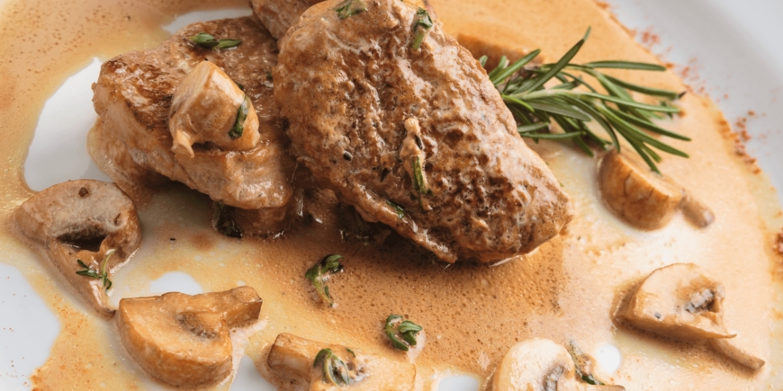 Сквозь мягкие переливы коричневого соуса на белом фарфоре проступает не просто пища, но целая история. Здесь аромат трав блуждает меж кусочками нежного мяса и обжигает ноздри, как легкий танец весеннего ветра. Грибочки, раскиданные по тарелке будто бы беспорядочно, напоминают о прогулках по осеннему лесу, когда каждый шаг вскрывает новые тайны. А веточка свежего розмарина – это ни что иное, как метафора жизни, всегда ищущей путь к небу. В этой симфонии вкусов и ароматов главная нота принадлежит куриному филе, нежно утопающему в сметанной неге. Оно словно интроверт, нашедший утешение в тишине, спрятанном глубоко внутри себя. Напоминание о том, что истина всегда скрыта в деталях, этот простой, но изысканный ужин пробуждает в нас нежные и тёплые воспоминания, словно старинная карта из детства, по которой можно пройтись лишь в мечтах.
