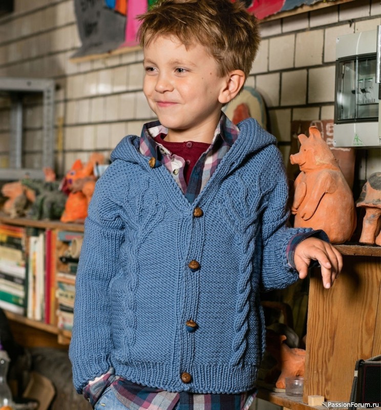 Жакет кардиган для мальчика. Описание и схема | Вязание спицами для детей РАЗМЕРЫ104/110 (116/122-128/134)ВАМ ПОТРЕБУЕТСЯПряжа (60% овечьей шерсти, 40% полиакрила; 85 м/50 г) — 450 (500-550) г дымчато-синей; спицы № 5 и 5,5; круговые спицы № 5,5 длиной 40 см; 5 коричнево-синих пуговиц диаметром 22 мм.УЗОРЫ И СХЕМЫРЕЗИНКАПопеременно 1 лиц., 1 изн.ЛИЦЕВАЯ...