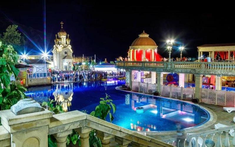 Ночь окутала древний город с его величественными строениями, украшенными огнями и яркими расцветками. Воздух словно напитан звукописью праздника — перезвон бокалов, смех и приглушённые мелодии, которые, кажется, высекают искры от зеркальной глади воды в центре сцены. Колоннады и мостовые, представ свои арки и тенистые проемы, напоминают о потерянных временах, когда история оживала в лицах прохожих, а улицы шептали загадки прошлого. Здесь и сейчас, среди разноцветных огней и теней, как эхом отдалённых эпох, звучат слова: "пусть никогда не утихнут наши голоса". Совсем рядом возвышается постройка с золотыми куполами, сияющая подобно восходящему солнцу на чернильно-тёмном небосклоне. Кажется, что даже звёзды спустились ниже, чтобы быть частью этого таинства, в котором древние мечты переплетаются с надеждой на грядущие времена. В этом зрелище, в этой красоте, каждый может найти себя — блуждающего по мостовой, прячущегося в тенях или отражённого в глубине глаз изысканных прохожих.