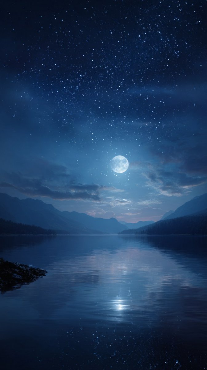 Безмятежная ночь: голубая луна над тихим озером и звездное небо. Картинка из нейросети Миджорни - Midjourney примеры промтов - Форум ИИ о нейросетях - Yes Ai