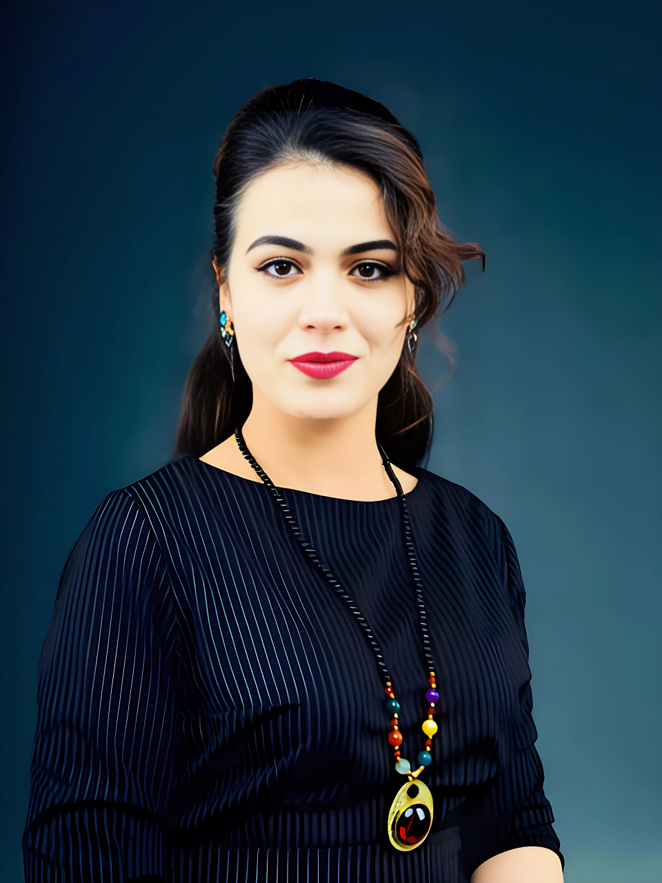 В её глазах спокойствие летних рассветов и уверенностью звезды, мерцающей на вечернем небе. Глубокий, темно-синий фон обрамляет её фигуру, как будто небо само создает для неё пьедестал. Тончайшие полоски на платье напоминают утончённую музыку дождя, которую слышишь только в одиночестве. Яркое ожерелье — это мост, перекинутый между культурой и искусством, свет и веселье бусин разбегаются во все стороны, как искорки. Волосы, собраные в лёгкую волну, будто веют морским бризом. Её улыбка — тонкая, лукавая — хранит свои секреты, как древние рукописи за толстым стеклом музейной витрины. Она — юнона и шерон, чудо и тайна, её лицо говорит о мире большем, чем утонченность эмоций на его поверхности.