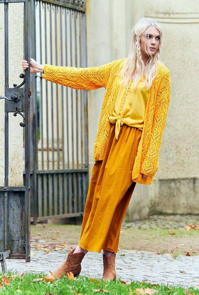 Тень золотистого осеннего утра легла на парк, и девушка, похожая на солнечный луч, появилась из-за кованых ворот, словно героиня из романа о потерянной эпохе. Её свитер из переплетённых, как старинные часы, нитей, обрамляет фигуру, придавая ей одновременно уязвимость и стойкость. Жёлтый наряд, отливая янтарём, гармонирует с ковром из увядающей листвы. Свет, играющий на её волосах, напоминает картины ранних импрессионистов, где каждое движение кисти — метафора недосказанных слов. В этом мгновении, полном загадок, чувствуешь тихий шёпот ветра, рассказывающего о мечтах, затерявшихся в небытие.