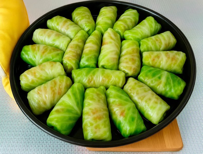 На круглой сцене огромного чёрного подноса, словно актёры в древнегреческом амфитеатре, ряды зелёных долек раскрывшихся капустных листьев соединились в единую картину симметрии и порядка. Каждый голубец — маленькая загадка, заключённая в зелёные покровы тайны, хранящая ароматные секреты семейной кухни. Округлые и мягкие, они будто шёпотом вспоминают о тёплых вечерах, когда большой круглый стол собирал всех под своим гостеприимным сводом. Этот почти церемониальный порядок роллов из капусты олицетворяет сплочённость и гармонию, создавая уютный, домашний микрокосмос. Нежная зелень, парадоксально светлая и насыщенная одновременно, вызывает воспоминания о весенних лесных полянах под теплым солнцем. Поднос обрамляет это гастрономическое собрание, создавая ореол спокойствия и завершённости. В этом простом, но изысканном узоре заключена вся палитра традиций, создающих мост между поколениями. Эти блюда смотрят на нас со знанием, что каждая порция несет в себе удовольствие момента и мелькающее счастье, овеянное ароматами укропа и сметаны.