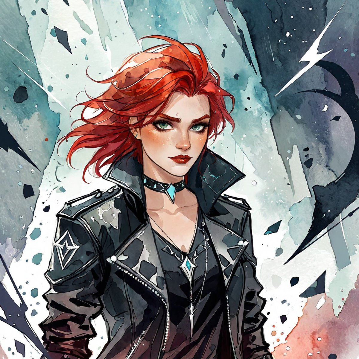 Перед нами воплощение бунтарской эпохи, в которой каждый мазок художника звучит музыкальной нотой протеста. Девушка стоит, как бывшая изутри платья из кожаной волны, окутанная вихрем контрастов. Ее красные волосы ослепительны, как закатное солнце, веют свободой и дерзостью. Тени и свет танцуют вокруг нее, создавая эффект разбившегося кристалла осколков, как будто сама природа подчёркивает её яростную независимость. Взгляд ее зеленых глаз словно приглашает в мир, полный загадок и судьбоносных решений. На фоне бушуют ветры рисованных пятен, напоминающих изломанный мир, из которого она вырывается, подмигивая случайному прохожему. Голос в ее голове – мощный рок-н-ролльный аккорд, разрывающий тишину вокруг. Этот образ говорит: "Я – не просто персонаж, я – голос волнения и вызова, которому под силу изменить реальность".