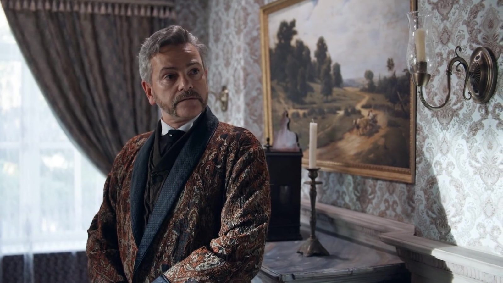 В золотых отблесках старинных подсвечников мерцает таинственность прошедшей эпохи. Комната, наполненная шуршанием шелков и звуками старого швейцарского механизма, выглядит как фрагмент из чеховской пьесы. Портрет на стене, словно окно в прошлое, ведет куда-то в глубь веков — туда, где простираются поля с проселочными дорогами, излучая тёплое сияние летнего вечера. Мужчина у окна, как памятник временам, стоит, замерев в раздумьях. Его взгляд пронзает пространство, обращая все оттенки благородной роскоши в один лирический аккорд. Это сочетание традиций и уюта веет легким ароматом чаепития с мятными подслетками — символ взаимопроникновения времен и эпох. Здесь, в мире обоев и штор, вырисовывается образ загадочности, который одаривает зрителя сюжетом нераскрытой драмы. Чувствуется аромат старины, живущий в легком налете воска на антикварных зеркалах, и приглушённый шёпот стен таит в себе целую библиотеку историй, блуждающих в уюте комнаты, застрявшей между мирами.