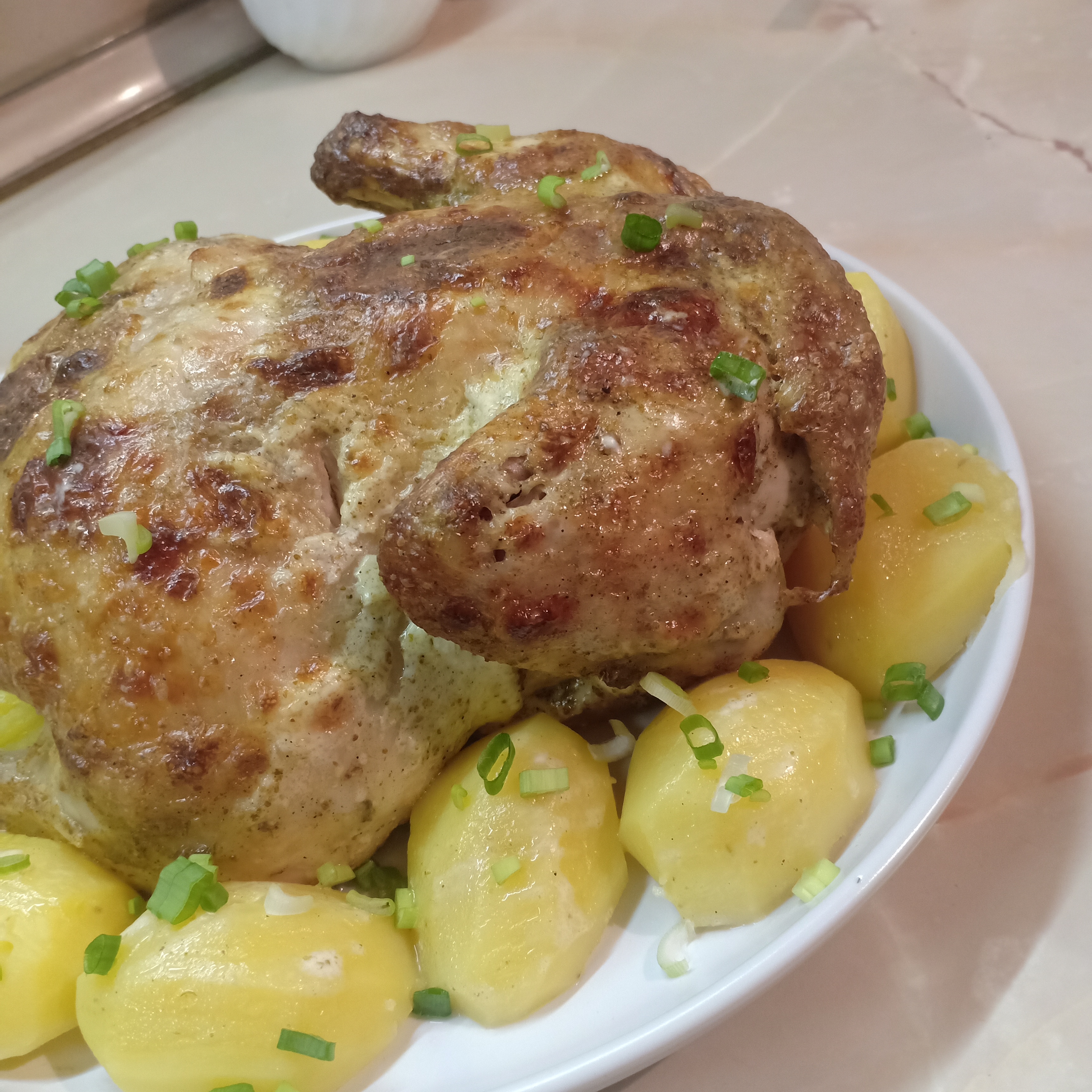 На этом блюде перед нами разыгрывается настоящая гастрономическая драма: румяная курица, словно золотящаяся осенними листьями, лежит торжественно на белоснежной тарелке. Ее кожа, покрытая хрустящими пластами, подобна древнему пергаменту, который хранит истории множества семейных ужинов. Картофель, как компания верных спутников, обрамляет её, демонстрируя скромное благородство простых радостей жизни. Зелёный лук бросает изумрудные искры, словно посылая привет из весны, врываясь в это тёплое пиршество. Это не просто еда — это путешествие в мир домашнего уюта и тихих вечеров, когда аромат запеченного ужина окутывает дом, подобно любимому пледу, согревая и утешая. В этом блюде слышатся голоса бабушек, напоминающие о важности тепла и доброты в каждом кусочке. Повсюду разливается свет воспоминаний о простых радостях и незабываемых минутах, освещая каждый тёмный уголок сердца.