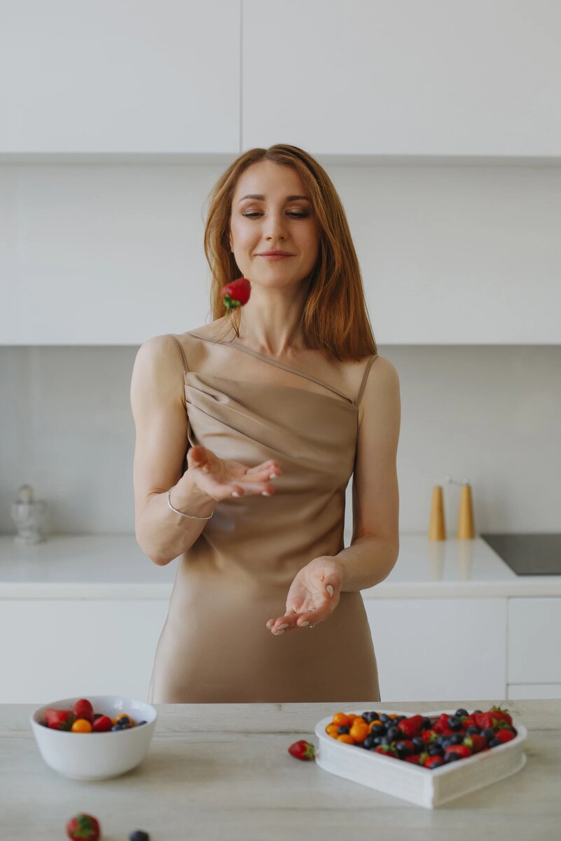 На светлой кухне времени остановилось, как в магической сказке. Женщина в элегантном платье цвета кофе с молоком будто играет с клубникой в танце, балансируя на грани детской игры и взрослой утонченности. Её руки, как дирижерские палочки, управляют движением красных ягод, словно создает симфонию из сладких нот. Она стоит в окружении идеальной белизны, где даже посуда, простая и строгая, служит рамой для её невидимой картины. Свет падает сквозь большое окно, наполняет пространство мягким сиянием, и кажется, что воздух наполнен запахом свежести и летнего сада. Где-то за кадром слышится мелодия утреннего радио, создавая гармонию дня, который только начинается. В этом мире, где каждый элемент собрался в легкую, почти незаметную композицию, слышится голос, напоминающий о спокойствии и равновесии. Эта сцена — как тихий момент откровения, когда настоящее сливается с мечтами и визуализирует сладость жизни.