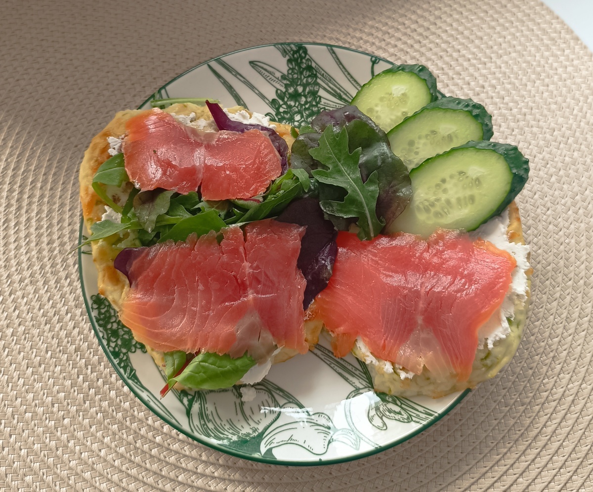 На потускневшем фоне уютного утреннего стола стоит тарелка, словно сошедшая с полотен голландских мастеров, декорированная замысловатыми узорами, будто сказочный лес на пороге нового дня. На ней нежно покоятся два бутерброда, ниспадающие осенними лоскутками лосося, эфирно перемежающиеся яркими зелёными поцелуями салатных листьев и свежими кружками огурца. Это не просто завтрак; это легкий ветер с моря, ласкающий обоняние, это мягкость крем-сыра, как поэт на берегу океана, создающий оду гармонии. Едва ощутимый шёпот приходит с изображения, как будто древняя рукопись рассказывает о наслаждении, о блюде, что соединяет грани мимолетности и вечности. В нём слышен шёлк заката, переходящий в утро, и тихий гомон старинных мест, где лосось был метафорой божественной нежности, а зелень — надеждой на вновь пробуждающийся мир.