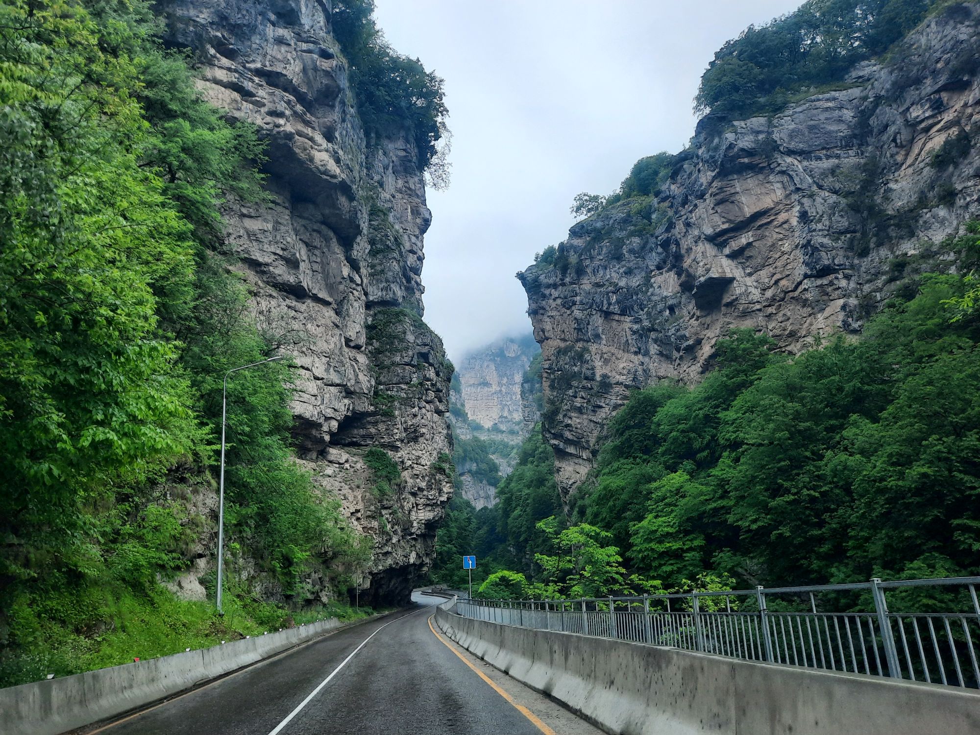 В самом сердце гигантского каменного лабиринта, словно сокрытый вековыми тайнами, притаился узкий путь, где природа и время заключили вечный союз. Дорога, словно заблудившись среди окаменелых исполинов, витиевато ведет своё путешествие сквозь величие скалистых стен. Их суровые граниты напоминают старинные крепости, охраняющие незримые секреты, спрятанные от праздного взгляда. В их тенях, среди переливающихся листвой вдоль дороги, можно услышать таинственные голоса, напоминающие народные сказания о далеких местах и незаметной силе природы. Далеко за стенами кедровых лесов мир погружается в атмосферу покоя и уважения перед непокорной красотой. Пространство тут нераздельно сливается с временем, а дорога — пульсирующая артерия, связывающая века и эпохи в единый поток. Сложно передать ту сладкую тоску по величию, вызываемую ошеломляющим видом окружающих скал.