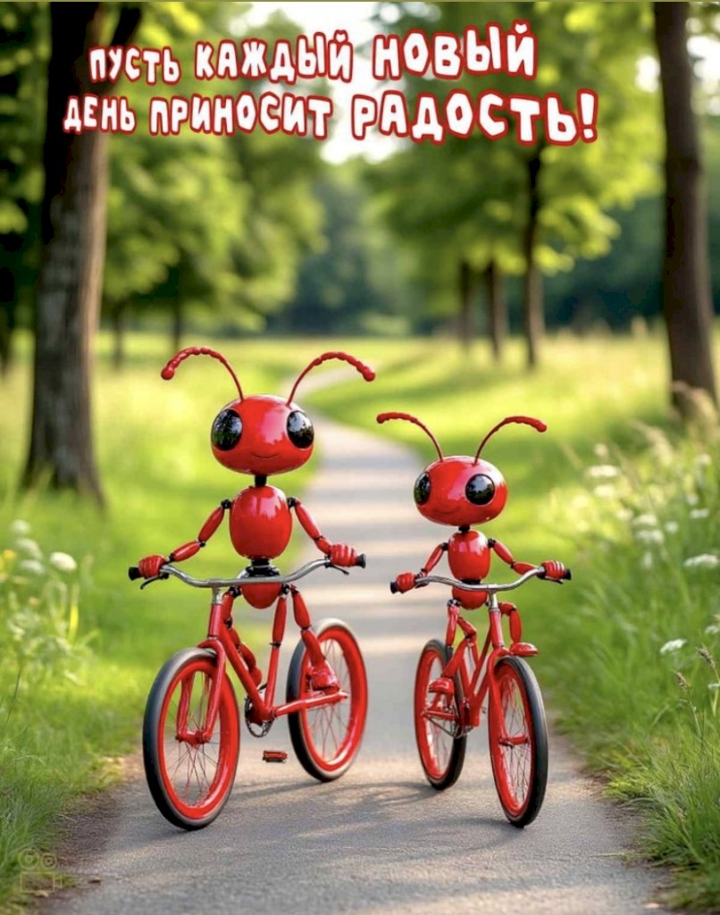 Очищенная от забот дорога наполняется ярким летним светом, будто сама природа решила рисовать, держа кисточку солнечного луча. Два живых деятеля, словно сошедшие с картины Сальвадора Дали, приветствуют мир своим существованием. Муравьи на красных велосипедах оживают в ритме бегущего облака на фоне зелёных деревьев, лопочущих о ветре. Их красные тела контрастируют с тёмной прохладой асфальта, где тени играют в прятки, прокладывая пунктир времени. В их беззаботном путешествии звучит хоромка: "Пусть каждый новый день приносит радость!". Каждая педаль — словно такт стихотворения о мгновении, дань простому счастью. Зеленый тоннель впереди зовёт их окунуться в мир грёз и светлых надежд, где каждый поворот — это новая возможность, а каждый новый путь — это бесконечная вероятность чудес.