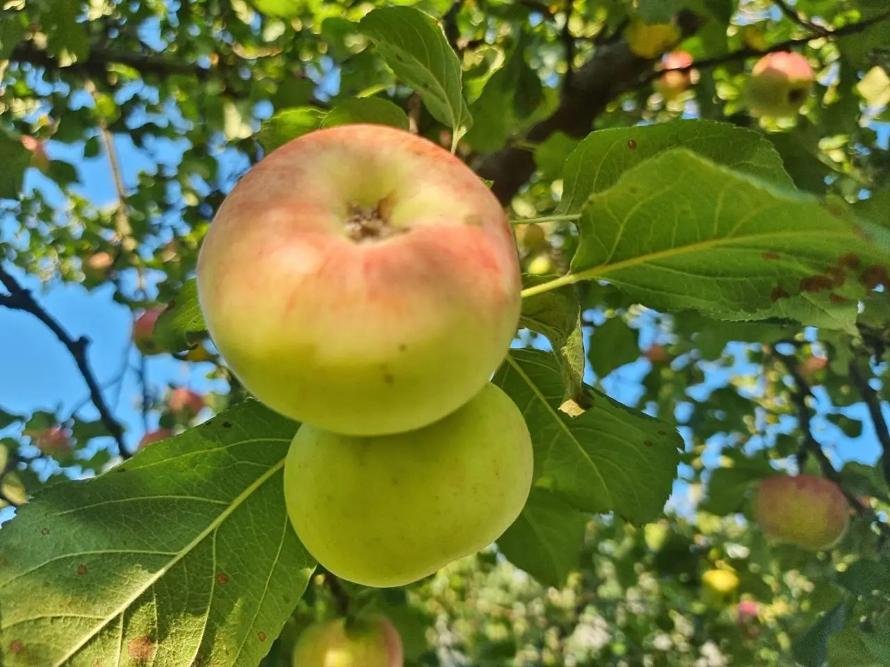 Сочная акварель позднего лета — яблоки на ветвях, как капли закатного солнца, предвещают близость осени. Каждый плод будто дразнит своей нежной румяной кожицей, цвет которой играет на границе зелени и зари. Листья бережно обрамляют плоды, словно режиссер, останавливающий мгновение на кульминационной ноте. Голубое небо, как скатерть без края, подчёркивает трепетный шёпот листвы и неподкупную красоту сельского сада, напоминая о вечном цикле природы. Под нежным прикосновением ветра кажется, будто сами яблони влекут глазами тех, кто жаждет вкусить их тайну.