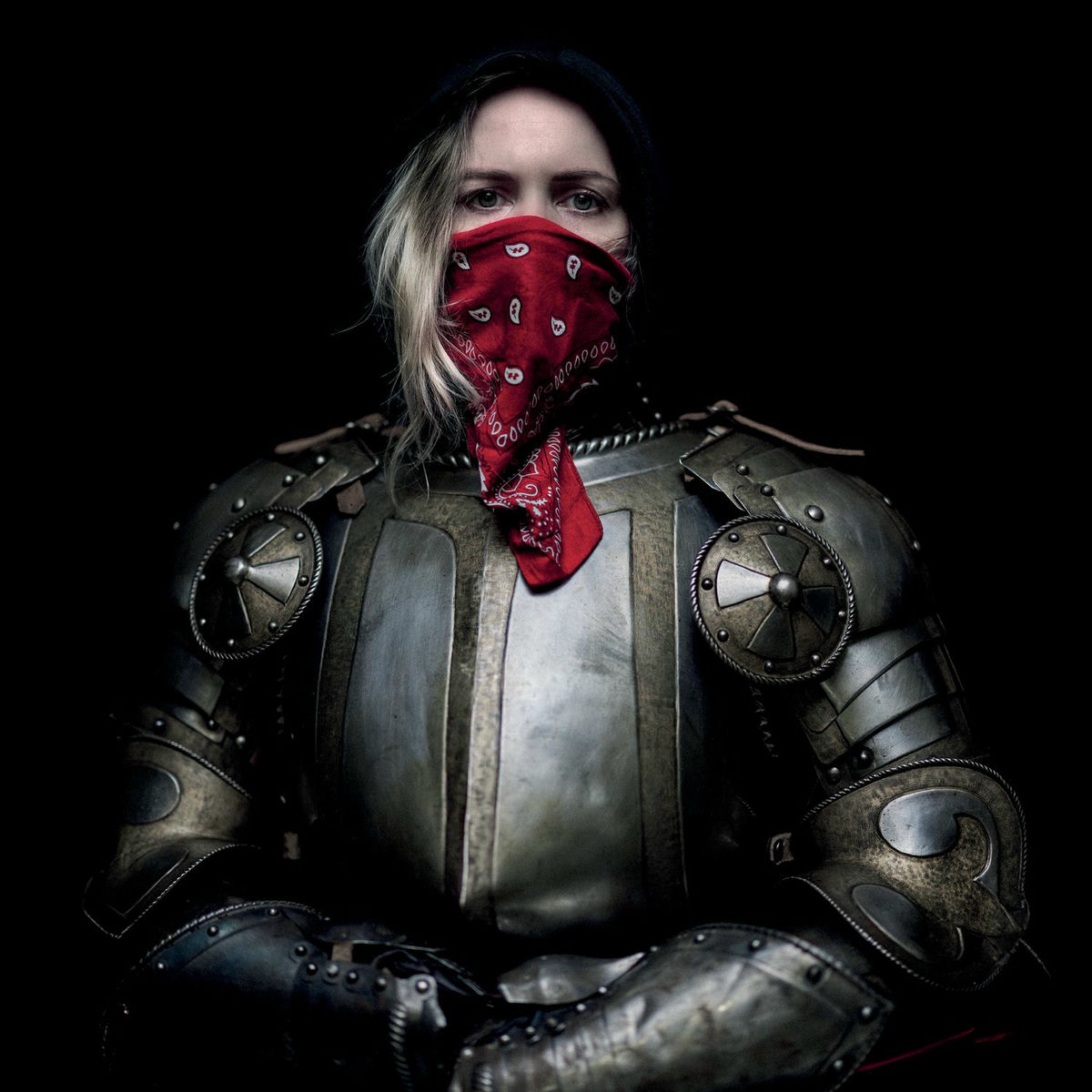 В густом полумраке, как из старинной легенды о бесстрашных рыцарях, является фигура женщины в броне. Эта женщина, словно порыв ветра в тени меди, готова бросить вызов всем ветрам и течениям судьбы. Её лицо закрыто алым платком, который дышит тайной и противоречием. Как будто в этом красочном шелке заключена вся её история — история непокорности и триумфа над трудностями. Металлическая броня блестит храбро, как лунный свет на древнем щите, и вокруг царит сосредоточенное молчание. Каждая заклёпка на её доспехах рассказывает о тяжести прошлого, а взгляд, ускользающий из-под лёгкой асимметрии, ищет горизонт, где сражения становятся славными песнями. Вой времени иссякает и трансформируется в мужественное спокойствие, а пульс истории вибрирует в воздухе, наполняя ночную тишину обещанием новой зари. Женщина во всеоружии смотрит прямо перед собой, но за её силуэтом едва уловимо шепчет надпись — тихий голос былого, который становится эхом вневременной саги о стойкости и надежде.