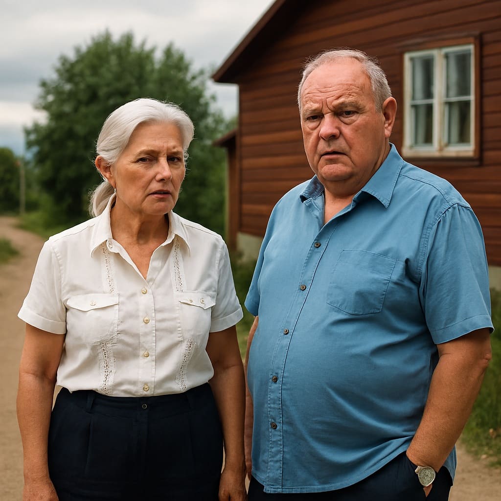Среди зелёных лугов, под нависающим небом, где облака сплетают танец теней, стоит пара, словно вышедшая из романа о русской деревни. Их лица обрамлены мудростью лет, а взглядом веет нескончаемая глубина. Мужчина в синей рубашке подобен могучему дубу, а рядом – женщина-корабль с белыми парусами волос. Дом на заднем плане, как немой свидетель, хранит воспоминания о прожитых годах. Стоят они на тропинке, полной песка воспоминаний, где каждый шаг отдаётся эхом в их сердцах. Слышится тихий шёпот ветра, перелистывающий страницы прошлого, и в этом есть нечто удивительно трогательное – свидетельство вечности маленьких историй, которые живут в сердцах и фотографиях.