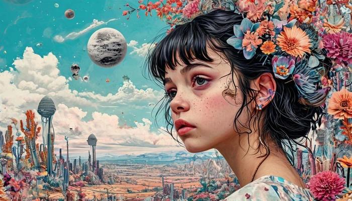 В этом живописном мире, где встречаются мечты и реальность, юная девушка, словно дух весны, застыла в окружении невиданного сияющего ландшафта. Ее глаза, глубокие и загадочные, как темные воды, отражают небесную безмятежность. Волосы, унизанные цветами всех оттенков, которые только можно представить, переливаются как радуга после долгой летней грозы. Вокруг неё разлиты планеты, свободно парящие в лазурном воздухе, и подмигивают вдали футуристичные городские купола. Этот мир кажется одновременно и знакомым из сказок детства, и совсем чуждым, как далекая и неизведанная планета. Здесь вершины сотканы из облаков, а цветы шепчут тайны старинных легенд. Шёпот ветра приносит отзвук далекой музыки, и трудно понять, где кончается небо и начинается земля, будто границы между ними стерты лёгким движением кисти художника. Преломляющийся свет бросает на девичье лицо мягкие тени, создавая иллюзию древнего портрета, где каждая черта говорит о мечтательности и грации, объединяющих миры искусства и природы в одно целое.