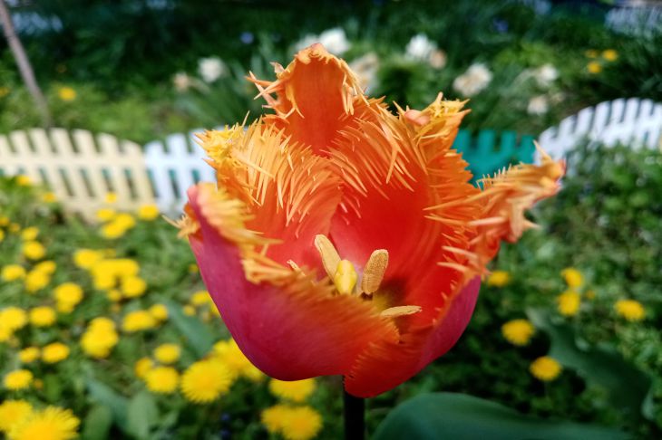 На зелёном троне, похожем на холст импрессиониста, распускается огненный тюльпан, устремленный к небу, как пламя свечи среди морского бриза. Его лепестки, украшенные рыжими ресницами, будто языки костра на фоне рассвета, танцуют в такт шёпоту ветра. Вокруг него, словно звездное небо, раскинулась поляна жёлтых одуванчиков, которые наблюдают с преданной покорностью. Белая оградка, как тонкие линии судьбы, очерчивает сцепление природы и человека. Скучный загородный забор превращается в рамку для картины, где бесконечно летнее настроение звучит в каждом цветке. Голоса природы — это тихая симфония, где каждое растение обретает свой голос. Подпись на фоне — это отголосок скрытых эмоций, шарм загадочного знака, давнего шёпота порядка и хаоса. Эта сцена, как парадоксальная встреча людей с природой, клубящиеся краски которой напоминают о вечных весенних днях, где романтика и радость сопутствуют травам и цветам.