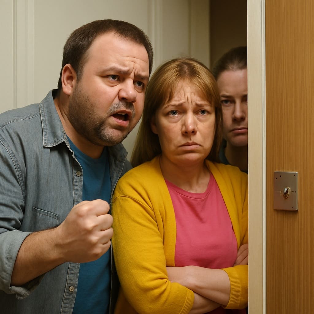 В зазоре двери, словно в рамке для живой картины, застыли три фигуры, каждая из которых воплощает привкус напряжённости, сквозящий в комнате. Мужчина в джинсовой рубашке, с поднятой рукой, как будто изрыгает гнев по ту сторону кадра, но в его жесте и голосе больше отчаяния, чем угрозы. Женщина в жёлтом, укутанная в цвет утреннего солнца, что наполняет комнату, смотрит прямо вглубь сцены, её взгляд — море тревоги, не знающей берегов. За ней располагается тень человека, пряча лицо в полутьме — молчаливый свидетель или, быть может, хранитель секрета. Все трое слиты в единый хоровод эмоций, их присутствие говорит о расположении и временности, о том, как пролетают секунды напряжения, разбиваясь о края деревянной двери.