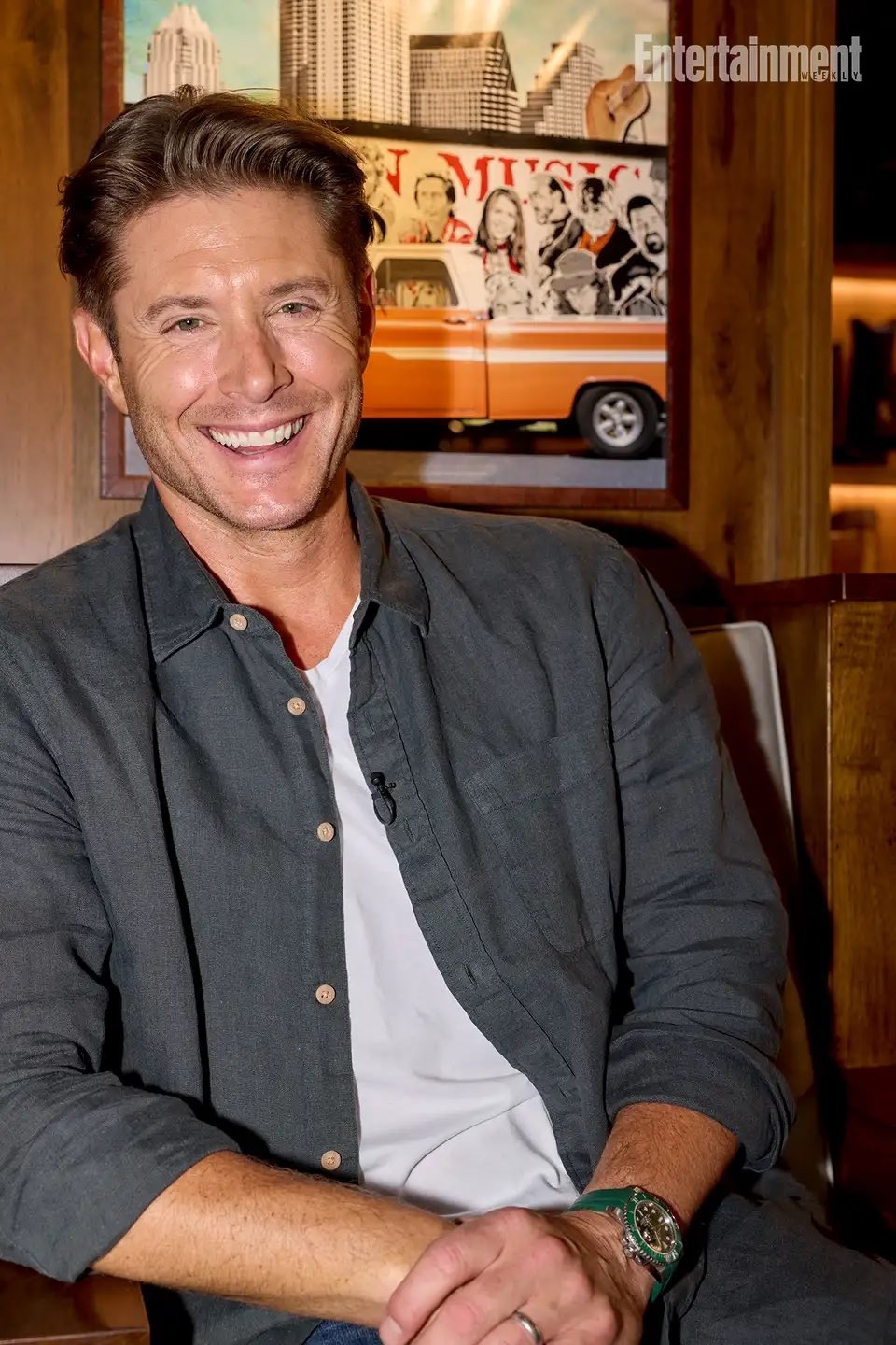 В этом теплом, искрящемся моменте, словно выхваченном из журнала о стиле жизни, герой сидит в уютной комнате с обложки глянцевого мира Entertainment. Его улыбка — это настрой на добро и помогательство, которым он продолжает поддерживать незримых собеседников, пересекающих невидимые границы экрана. Позади него — картинный мир городской мечты, где улицы плывут в живых красках, словно сказочные призмы, и где каждая деталь связана тонкой невидимой нитью. Яркие постеры на стенах — отзвук эпохи, голос которой давно уже уступил место шепоту. И вот он, средоточие света среди теней, наблюдатель, рассказчик и, в какой-то мере, проводник в этот мир. Слова, запечатленные в неподвижном танце строк, вызывают трепет, как будто шепчут важные тайны тем, кто готов слышать голос музыки города.