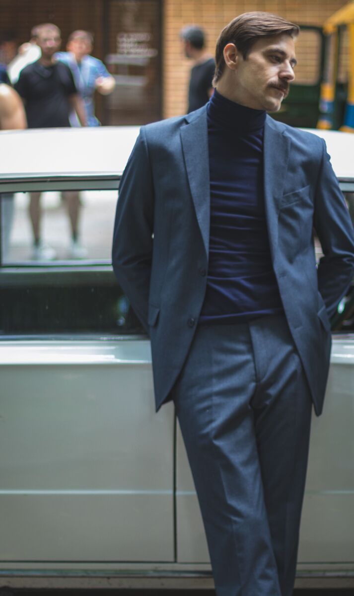 На переднем плане, в центре, образ человека, стоящего в час пик у белоснежного авто, представляющего собой символ городской утончённости и динамики. Его строгий темно-синий костюм и водолазка отсылают к времени, когда мужчинам было свойственно носить такие вещи с особой элегантностью. Густые усы, которые, кажется, подчеркнуты карандашом, добавляют лицу загадочности, как будто он герой старого фильма, затерянного в шуме мегаполиса. Позади него мимолётно проходят люди, размытые в своей суете. Зодчество улицы, на которой стоит главный герой, проявляет своеобразие в кирпичных тонах, намекая на историческую значимость каждого квадрата асфальта. Весь этот антураж напоминает о романтической мороси, оставляя после себя лёгкий налёт меланхолии. И всё же, сквозь эту вязь будней и воспоминаний, слышится шёпот событий, происходящих в тесноте городских джунглей, где каждый прохожий — отдельная история, не рассказанная, но столь желанная к раскрытию.