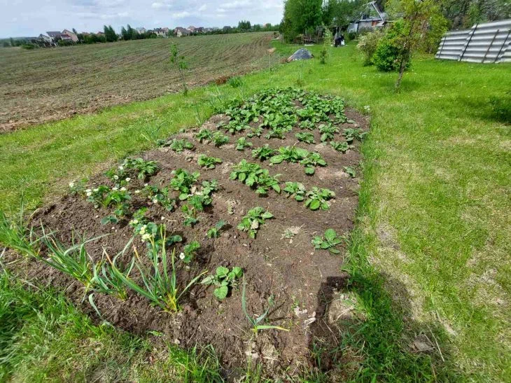 На этом участке земли лежит само олицетворение весны и надежды. Огород, словно маленькая вселенная, простирается под светлым небом, играя зелеными листочками на фоне распаханной земли. В этой сцене чувствуется спокойствие, как в картинах Шишкина, где каждый лист стремится к солнцу, а каждый кустик готовится к невидимой схватке за жизнь. У самой кромки, как сторожа, застыли строчки чеснока, вытягиваясь вверх с искренностью ростка, только каснувшегося света. Зелень над землей — как музыка весны, мелодия, которую ведут природа и труд человека, переплетаясь в этом тихом уголке мира. Вдали виднеются дома, они, как молчаливые свидетели, смотрят на усилия земледельца, превращая это пространство в тихое царство зелени и плодородия.