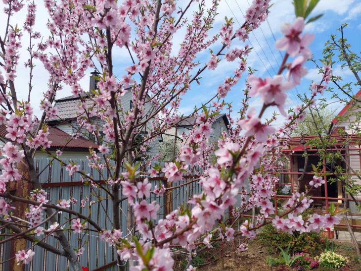 Словно окунувшись в легкое дыхание весны, мы переносимся в мир, где удары веера тончайших цветущих ветвей рисуют на фоне небесного полотна. Молодые лепестки, словно перламутровые шаги утренней росы, касаются щеки мира, пробуждая его после зимней спячки. Изломанные ветви расчерчивают воздух, и под ними - пресыщенный тишиной забор, пытающийся вместить в себя красоту природы. Вдали мелькают крыши домов, будто бы притворяясь горбами крепких кораблей в морском плавании. Это место напоминает о том, что в мельчайших деталях сосредоточена суть жизни, её непреложная музыка. Здесь центральный игрок — цвет, тот самый розовый, где бушуют эмоции, словно простая блуждающая мелодия в густом лесу всего земного бытия. Скрытые в киноленте жизни, времена года тихо переговариваются, и весна объявляет свою победу легким касанием цветов, как нежным шепотом утреннего ветра.