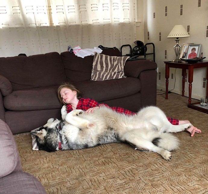 В уютной, словно из детских снов, комнате, на фоне мягкого дивана, девочка в клетчатой пижаме и большой серый хаски находят гармонию в совместном сне. Их объятие, наполненное доверием и теплом, становится центром вселенной этой сцены, чей лейтмотив — спокойствие. Свет, просачивающийся сквозь полупрозрачные шторы, словно полуденная дрёма, ласкает обои, на которых время оставило отпечаток. Рядом скромно расположились фотографии, напоминая о вечности семейного альбома — символ жизни, текущей незаметно и тихо, как сегодняшний день. Тишина комнаты, порой нарушаемая лишь трепетом света, обволакивает своим мнимым спокойствием, создавая иллюзию мира, где царствуют спокойствие и доброта. Здесь каждый уголок будто хранит воспоминания, запасы счастья, что припасены на случай долгих зимних вечеров.