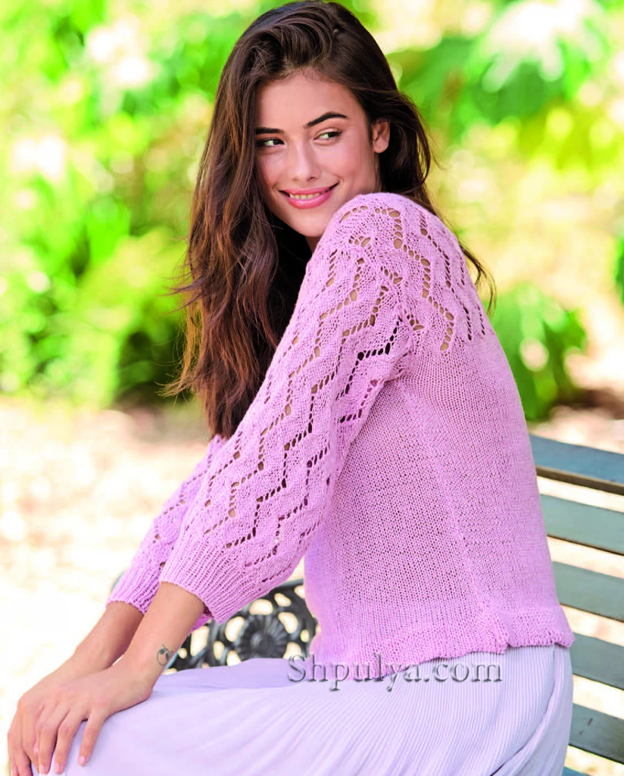 Акцент на линии плеч достигается за счет красивой ажурной кокетки и рукавов с такой же воздушной структурой .Остальная часть пуловера вяжется обычной лицевой гладью, а нижняя планка – двойным узором.
