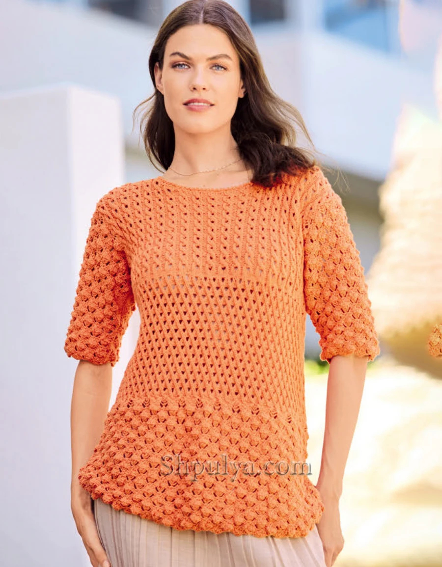 Этот просторный вязаный пуловер с рукавами до локтя привлекает не только чудесным цветом омара, но и великолепным миксом узоров – в виде пузырьков, решетки и «кос». Край горловины обвязан с помощью крючка«рачьим шагом».