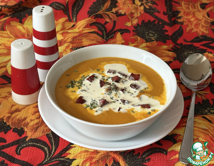 - Приготовить ингредиенты. Почистить овощи и нарезать кубиками. На растительном масле обжарить картофель с морковью. Добавить куркуму и зиру, обжарить 1-2 минуты. Добавить томатную пасту и промытую чечевицу, посолить и поперчить. Влить воду или бульон, варить около 15 минут. Не вливайте всю воду сразу, так сможете регулировать густоту супа. В это время обжарить мелко нарезанную копчёную колбасу или сухарики. Натереть или выдавить чеснок. Влить сливки, добавить чеснок и пюрировать суп. Попробовать на соль/перец, если надо - приправить. Сейчас можно отрегулировать густоту супа, добавив ещё жидкость. Подавать, посыпать колбасой/сухариками и полив столовой ложкой сливок.