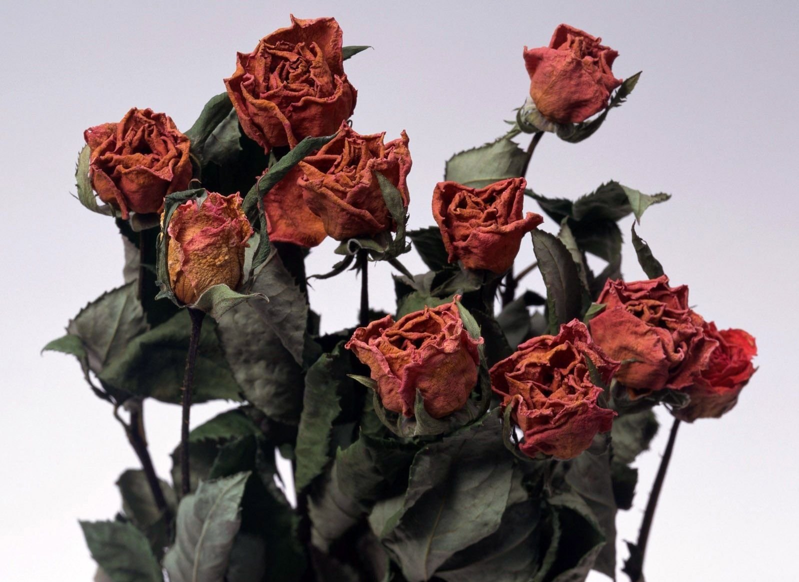 Тусклая патина времени покрыла букеты увядших роз, словно шепот осени ожил в причудливом вальсе теней и света. Каждый лепесток, впитавший в себя истории ушедших дней, трепетно рассказывает о своих романах и драме, как если бы за каждым изящным изгибом скрывалась целая глава. Палитра рыжих и коричневато-зелёных тонов рождает образ старинных картин, которые размыты ножом времени, но от этого ещё более трогательны, волшебны и живописны. Ощутив аромат увядания, можно услышать звонкие ноты готической баллады или звуки забытого кларнета, звучащего в хриплых звуках завальсировавшего по лугам времени ветра. Подобно герою триллеров прошлого века, эти цветы говорят о бренности бытия, и мы невольно становимся частью форума, где время - суровый модератор, а эти розы - тихие, но упорные безмолвные истории о прошедшей любви и забытой надежде.