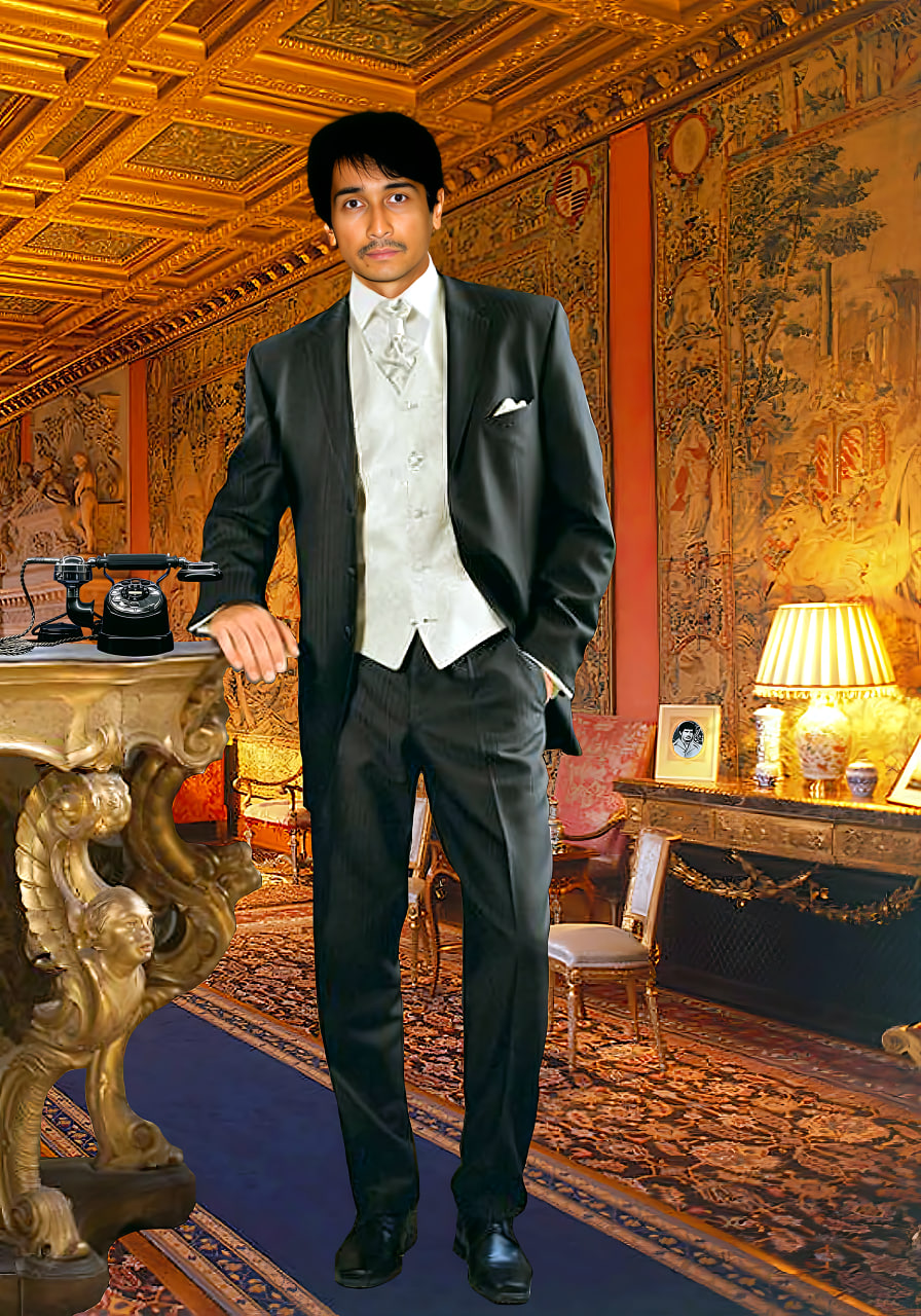 Высокие потолки, облачённые в золото, создают иллюзию дворцовой неги, где прошлое и настоящее сплетаются в изысканном танце иронии и роскоши. В центре сцены – человек, чья фигура словно выткана из нот аристократической грации и современного шика. Его взгляд, устремлённый в пространство, наполнен задумчивостью, отражая тайны комнат, богатых замысловатыми гобеленами. Гобелены, на которых оживают призраки старины — эпосы и мифы, где каждый стежок — рассказ, привносящий новое дыхание в степенный узор прошлого. На массивном столе, словно страж времени, простуженный телефон, чёрный дух коммуникации, отвергающий забвение, шепчет неуловимые фрагменты разговоров. Вечерняя лампа, как луна в сиянии комнатной тишины, бросает свои мягкие лучи на старинный фотоальбом, хранящий в себе воспоминания, согретые теплом прошлого. И всё это — одно молчаливое полотно бытия.