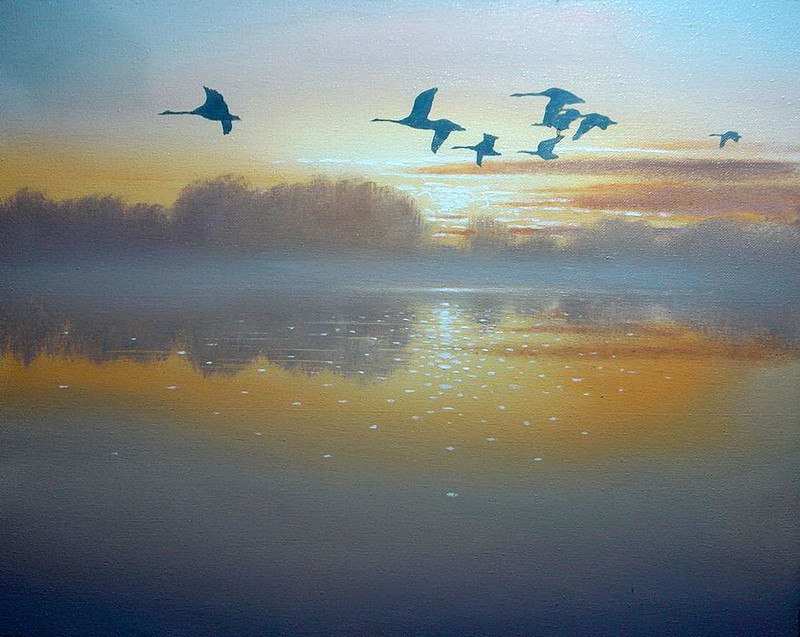 Мир застыл в золотистом свечении, как старинная картина, запечатлевшая торжество природы. Стая птиц, словно живые кисти художника, чертят небо на фоне акварельного рассвета. Их крылья распахнуты, как страницы неведомой книги, наполненной историями далёких странствий. Вода туманного озера отражает их полёт, превращая свет и тень в тонкую ткань воспоминаний. Лёгкий ветер шепчет прощание ночи тонкими нотами жидкости, разрежая таинственный туман. В этом пленительном молчании слышится стремление к свободе, как будто само утро зовёт за собой в бесконечность. Блики на воде в танце теней и света, похожи на остановившиеся мгновения, живущие в каждой капле. Стоим на берегу, чувствуя энергию природы и тихое присутствие вечности. В этом нерушимом союзе неба и земли, отражение вдруг открывает неведомые дали, где всё еще возможны чудеса и где каждое утро — новый мир.