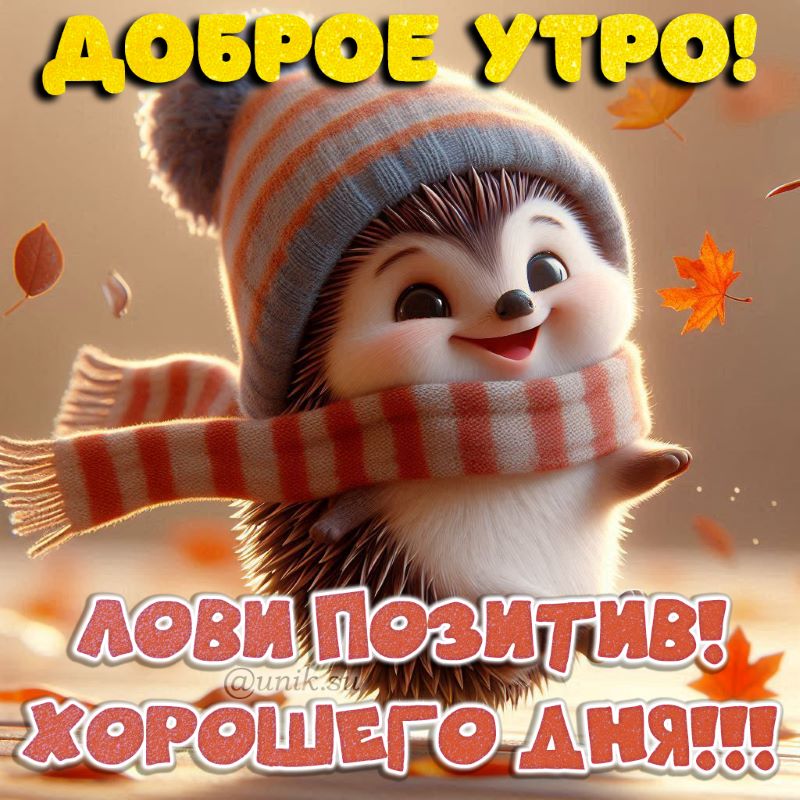 Наступило утро, как новое начало, как первая страница в захватывающей книге, написанной осенним настроением. Маленький ёжик улыбается миру из лёгкого тумана, словно главный герой пьесы о доброте и радости. Он укутан в шарф цвета оранж из старых фильмов о Париже, и на самом краешке шапки, будто незаметный пассаж в симфонии, осенний лист кружится в танце. Небо обнимает землю красками зари, и каждое пожелание доброго утра звучит как аккорд гимна свету и надежде. Это не просто приветствие — это магия, превращающая каждое мгновение в праздник. Лови позитив, как неожиданный подарок от мира, словно мотивация на холсте моего внутреннего мира. Пусть осенний ветер будет проводником к новым свершениям, даря лёгкость и свежесть. И свет, пусть освещает путь, открывая возможности. Как удивителен этот день, полный обещаний и возможностей.