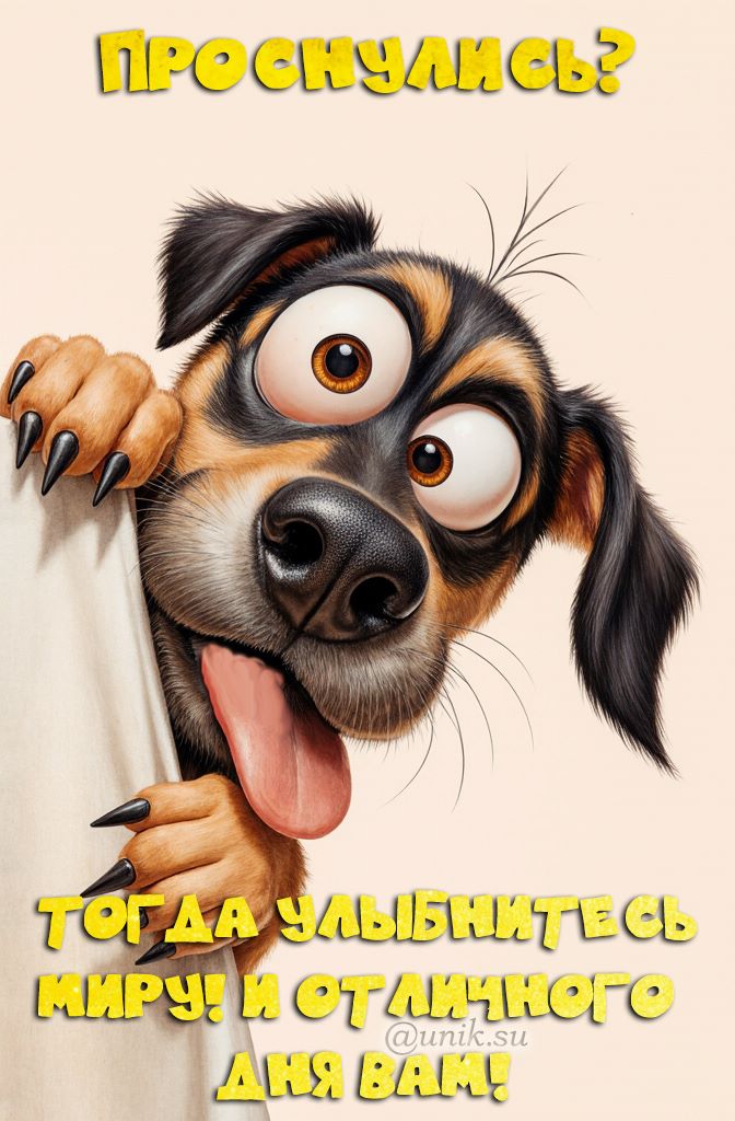 В утреннем полумраке, когда сон ещё жмётся к нам краями тёплого одеяла, прокрадывается лукавая улыбка. Это не что иное, как веселая мордочка пса, заглядывающего из-за края двери. Его глаза, наполненные живым бликом, как два солнечных круга, светятся нескрываемым задором. Он будто спрашивает: "Проснулись?", и у нас нет иного выбора, кроме как ответить ему взаимной улыбкой. Мягкая шерсть, торчащая в разные стороны, словно перья ангела, создаёт ощущение лёгкости и мирной радости. Слова, идущие от души этого хвостатого проказника — "Тогда улыбнитесь миру! И отличного дня вам!" — звучат как девиз для нового дня, призывая принять его со всей полнотой. Это послание проникнуто светом, как утреннее солнце, которое выбрызгивает со всех сторон, награждая каждый уголок комнат той самой теплотой, которая способна растопить любые тревоги. И кажется, что вот-вот в воздухе разольётся аромат свежесваренного кофе и тонкий запах восстанавливающего баланса дня.