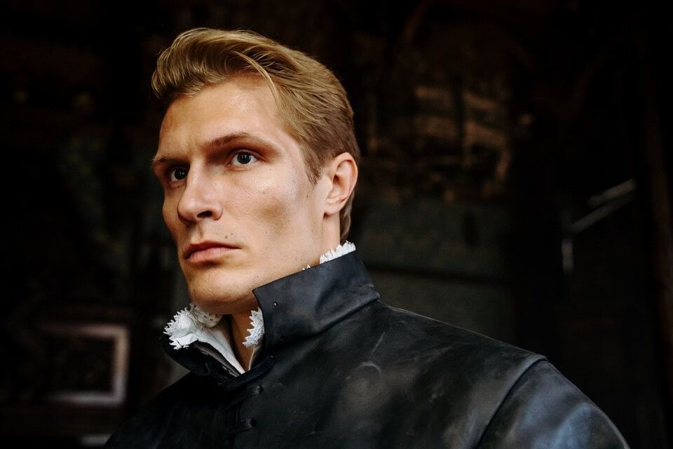 На тёмной сцене, где расплывчатый свет струится сквозь мутные стёкла, стоит мужчина. Его лицо – словно вырванное из старинного портрета, тонкими резцами мастера высеченное из мрамора. На нём – сосредоточенность, как у мореплавателя, что устремлён в неизведанные дали. Воздух напоён ароматом кожаного воротника его куртки, словно оберегающей от ветров и сомнений. Взор – пронзителен, как у героя из трагедии Шекспира, готового к последнему монологу. Складки на рукаве – маленькие горы драматических событий, которые он держит в сердечной памяти. Звучит шёпот старины, скрытый в нём самом, перекликаясь с тёмными узорами фона. Это не просто образ, это момент, когда история и современность соединились в унисон. Это повесть о прожитой жизни, о переулках, вымощенных камнями грусти и надежды.