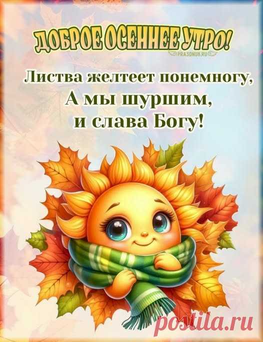 Это утро соткано из золотых нитей листвы, что осыпается по ветру, словно мудрые мысли осени. Картинка, где солнечный персонаж, окружённый листьями, выглядывает с нескрываемой радостью из своего зелёного шарфа, будто ребенка завернули в одеяло из бабушкиных мифов о голландском златоткани осени, превращает текст в песню, звучащую на языке успокоения природы. "Доброе осеннее утро!" — гласит надпись, как приветствие нового дня, наполненного мелодией падающих листьев и шуршаниями, словно жизнь вновь обретает смысл в этой играющем тишиной симфонии. "Листва желтеет понемногу, а мы шуршим, и слава Богу!", как молитва к небу, чтобы оно укрыло заботы ковром изистых историй и вечной надежды на возрождение. Взгляд его глаз синими озерами погружается в глубины наших сердец, где каждое утро — новая глава в вечной книге перемен и цикличности вселенной.