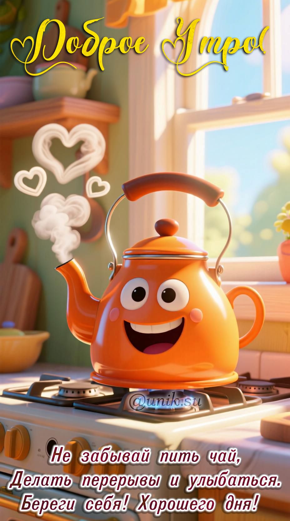 На солнечной кухне, где свет играет бликами на керамическом столе, сидит оранжевый чайник с лицом, полным доброжелательности. Он словно мудрый советчик из сказочного мира, готов поделиться утренним теплом и пригласить в мир уютных ритуалов. Из его носика, как из волшебного лампы, клубится пар, рисуя в воздухе сердца, что окутывают комнату особенной добротой. Над ним, почти придавая голос этому глиняному рассказчику, струится надпись "Доброе Утро!", звуча как мелодия времени пробуждения и первых дел. Справа, на фоне открытого окна, запах свежей народука настойчиво переплетается с чайным ароматом, создавая утреннюю симфонию, где каждый звук — ода покою. Под надписью — нежный призыв не забывать о простых радостях: пить чай, улыбаться, беречь себя — как если бы этот день был соткан из лёгких взмахов судьбы.