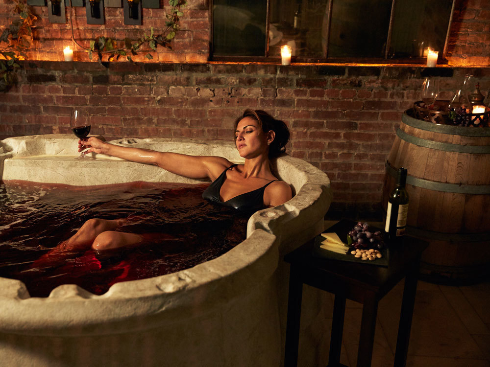 В полутёмном зале, где свет от свечей трепещет на старинных кирпичных стенах, женщина, словно богиня, погружена в винные глубины. Её тонкая рука держит бокал, полный красного вина, и кажется, что ему вторит аромат напитка, наполняющий пространство лёгким виноградным облаком. Очищение происходит не только для тела, но и для души. Бочка в углу напоминает о средневековых традициях, где вино считалось истинной амброзией. Здесь время, словно застыло, в паузе между вдохом и выдохом, оставляя лишь ощущение покоя и героизм из прошедших веков. Гроздья винограда и тёмная древесина на столе воплощают изобилие природы, гармонирующее с тишиной и роскошным спокойствием момента.