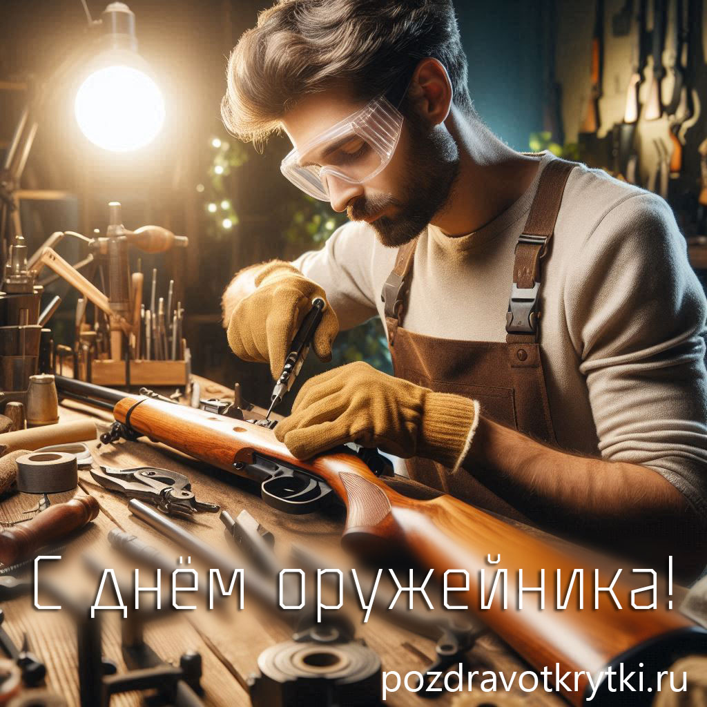В полумраке мастерской, окутанной теплом ламп и затаенным шепотом старых историй, молодой мастер склоняется над своим творением. Его движения точны и аккуратны, как у музыканта, извлекающего мелодию из струн забытой рапсодии. Очки блестят в мягком свете, отражая сотни крошечных искр — или, может быть, мечтаний, витающих в воздухе. Взгляд его полон сосредоточенности и тихой радости, которая разливается по помещению вместе с ароматом древесины и смазочных масел. Он работает в мире, где каждый винт, каждая пружина говорит с ним на языке механизмов и гармонии. Надпись «С днём оружейника!» не просто слова — это эхо голосов, благодарящих мастера за умение творить заботливой рукой. Настоящее искусство всегда возвышает, и мастерская становится храмом ремесленников, где каждый день приносит обещание новых открытий.