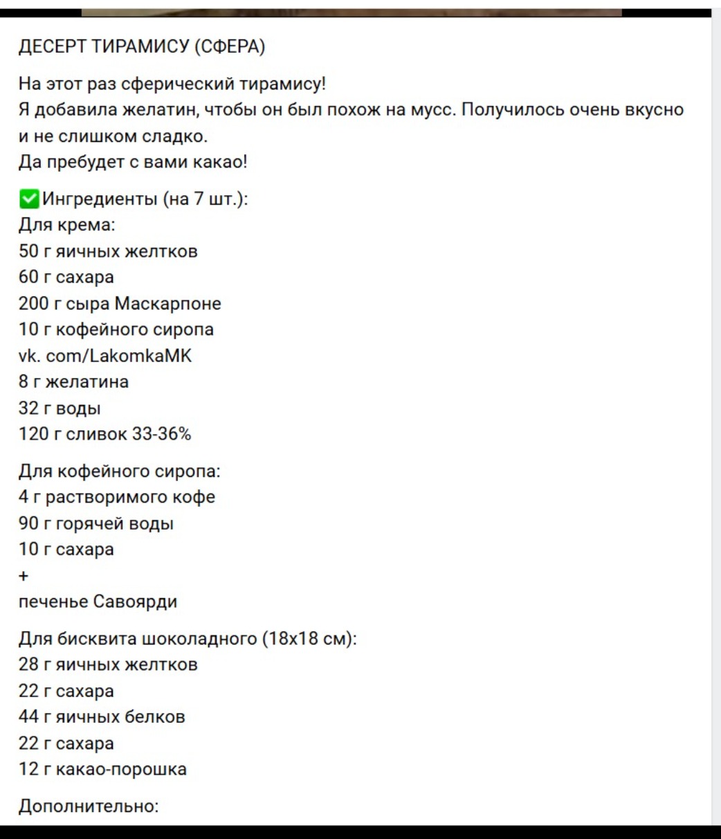 В пышной симфонии кулинарии, словно за стеклянной витриной, притаился сиюминутный шедевр искусства: сферический тирамису. Волшебный десерт, трепетно созданный из тончайших нот маскарпоне и эха кофе, обещает окунуть вас в бездну сладостного уюта. Каждое слово здесь как часть волшебного заклинания, где желатин, словно прищур солнца, одевает вкус в одежду мусса, обещая наслаждение в каждом кусочке. «Да прибудет с вами какао!» — звучит как тост за праздник вкуса. Словно герои эпоса, ингредиенты раскрываются перед нами, отдавая свои секреты, как свиток древней книги, сохраняя оттенки древнего наслаждения. Вода, сливки, и маскарпоне вступают в танец, следуя за тайнственным шелестом кофейного сиропа, и каждое объятие субстанций сродни тихому разговору на языке кулинарии. Здесь каждый грамм сахара словно нота в симфонии, и печенье Савоярди, как вечный спутник, дополняет композицию, оставляя на губах вкус нежной магии. Идея сферы — это метафора цельности, законченности, вечного движения, убеждающего нас в том, что в этом мире один десерт может быть вселенной.