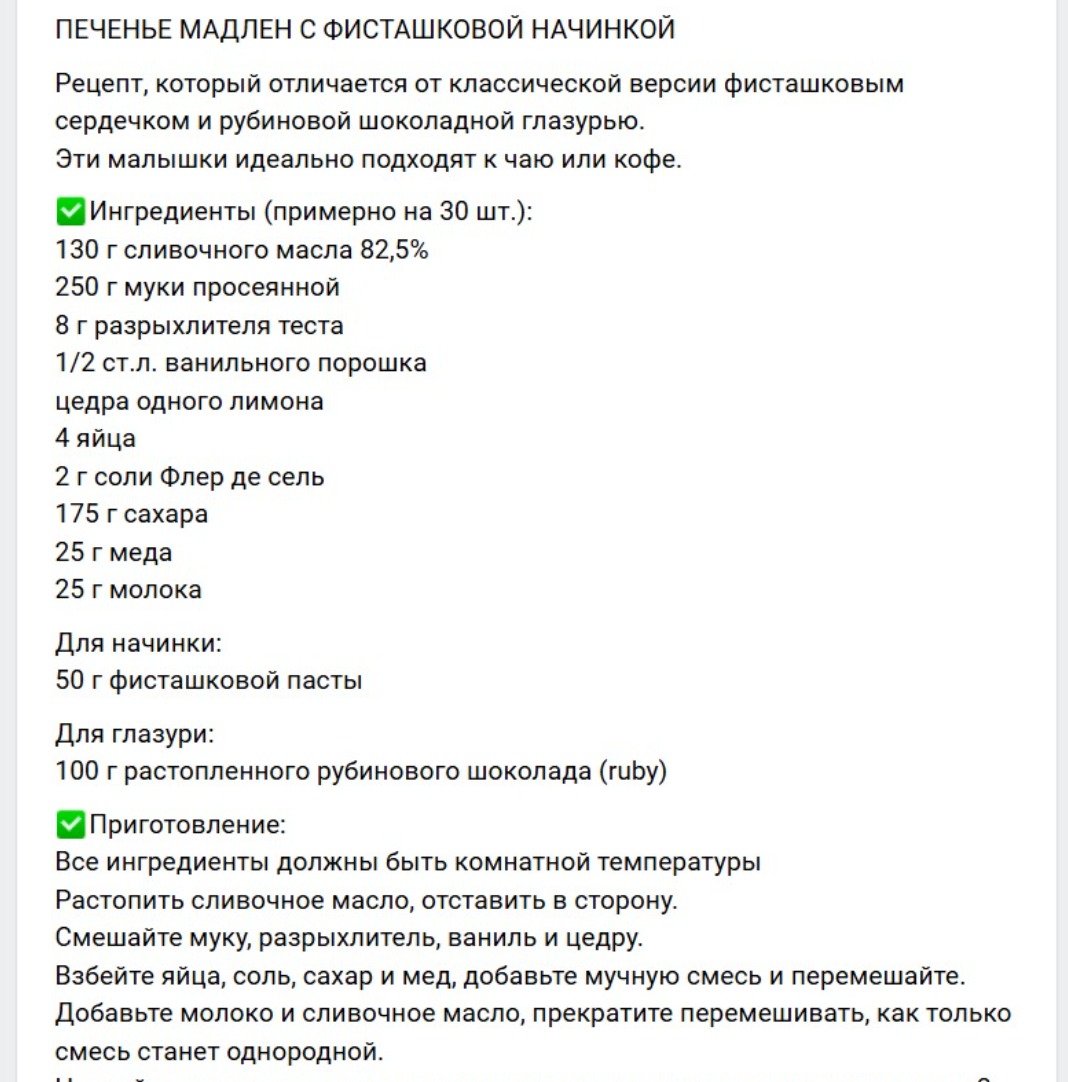 В этом тексте, как в уютной французской кухне, витает запах ванили и лимонного цедра, а невидимым шёпотом звучит обещание гастрономического удовольствия. Читается он, как приглашение на чай, где вместо слов нас встречает утончённый мадам Мадлен. Её сердце — фисташковая начинка, напоминающая о средиземноморском бризе и тёплых вечерах на берегу. Рубиновая глазурь блестит, как загадочный солнечный зайчик, явленный нам благодаря шоколаду, издревле связанному с божественностью вкуса. Эта композиция, рожденная из простых, но благородных ингредиентов, приглашает нас прикоснуться к вечности через каждый кусочек, даря моменты гармонии и спокойствия. Шорох муки, растворяющееся масло и голос задержанного дыхания — это как будто сцена откуда-то из фильмов, где кулинария становится актом любви и творчества.
