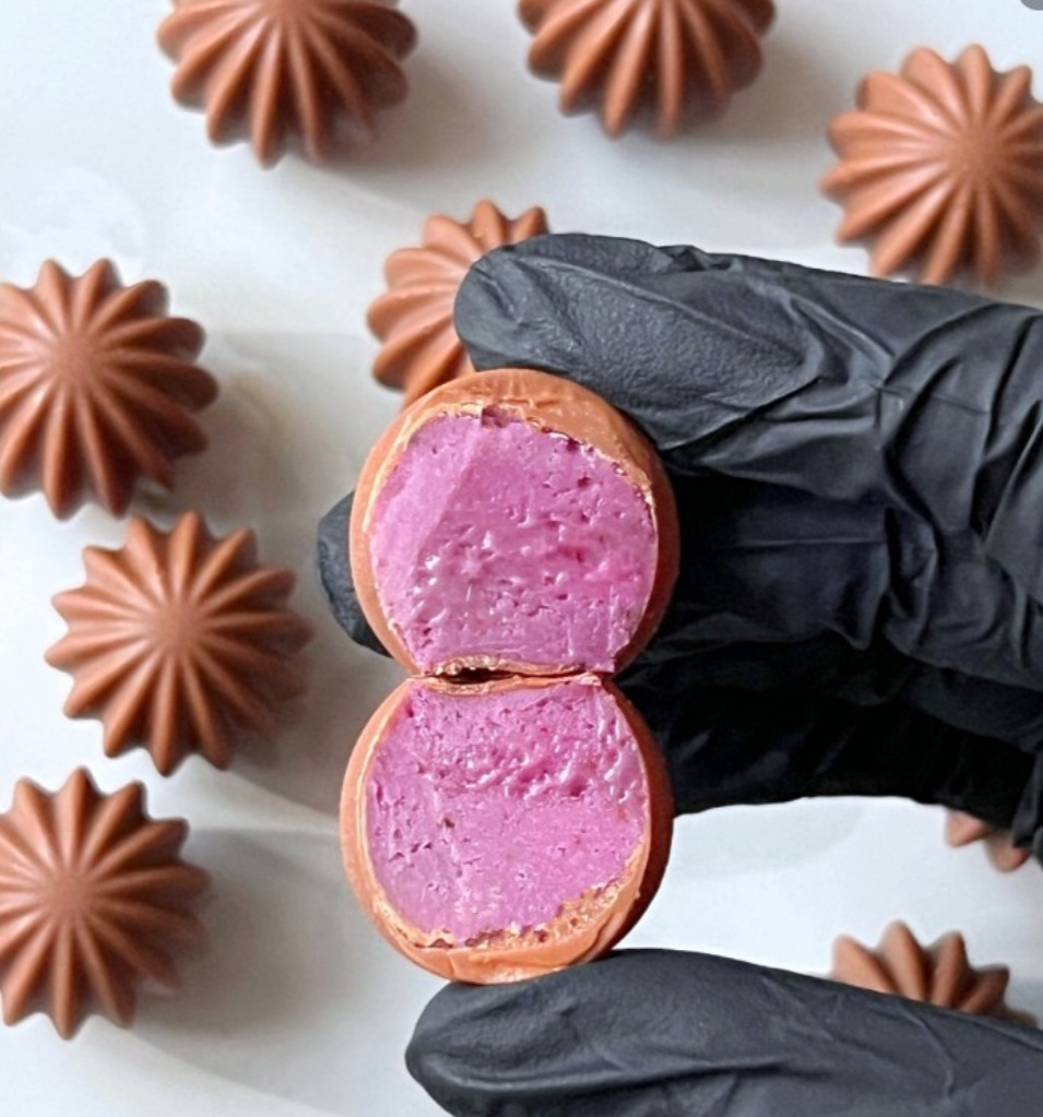Эта сцена — как изысканное заклинание для гурманов, где волшебство вкуса застыло в мгновении. В чёрной перчатке словно в руке алхимика, находящем тайное зелье, мерцает маленькая шоколадная сфера. Её сердце — ярко-розовое, зыбкое, как утренний закат в ледяную ночь северного края. На белом мраморном фоне, окружающая поверхность, словно фоновая симфония из шоколадных вершинок, манит обещанием сладости. Каждый штрих здесь — как узор бабочки на шелковом платке. В этом миниатюрном произведении кондитерского искусства заложена великая космогония вкусов, вызывающая в памяти воспоминания о давних ярмарках и тихих вечерах, проведённых в свете старинных торшеров.