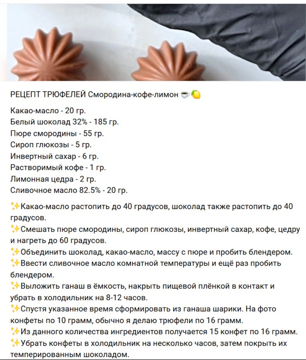 На этом изображении через призму кулинарной алхимии раскрывается таинственный мир шоколадных трюфелей с ароматом смородины, кофе и лимона. Темный акцент фотографии, словно чернильная ночь, прячет в себе два изящных трюфеля, напоминающих экзотические звездочки. Их поверхность блестит, как если бы звезды запечатлелись в утренней росе. Это мастерство формы и вкуса, грациозно соединяющее белый шоколад со смородиновым пюре, шепотом звонких лимонных цедр и гладкости какао-масла. Текст рецепта на фотографии кажется заклинанием, в котором скрыта тайна сладкого наслаждения. Словно алхимик в белом халате, читатель погружается в процесс приготовления: нагревает шоколад словно мир, приближаясь к идеальному балансу, пробивая массы блендером, чтобы извлечь сущность сладкого экстаза. В каждом шаге сквозит аромат рукоделья, творчества и стремление к идеалу. Кухня превращается в лабораторию вкусов, где грани реальности стираются, и остаются только смелая фантазия и сладкая мечта.