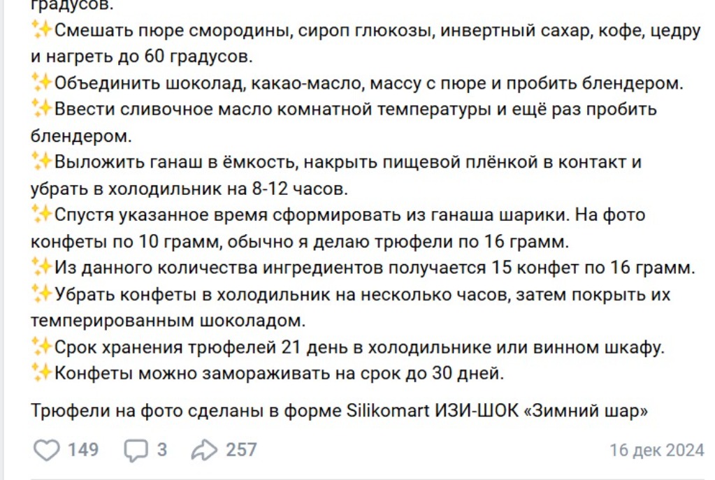 Теплый свет кухонной лампы обволакивает уютное пространство, где творится магия создания меланхоличных шоколадных трюфелей. Черная смородина шепчет тайны лета, смешиваясь с терпким ароматом кофе. Гребень ножа разделяет плотный шоколад, унося за собой сладкие обещания. Блендер, словно джазовый саксофон, настойчиво разносит по текстуре плавный мотив из какао и масла. Здесь, на границе воображения и вкуса, в форме Silikomart ИЗИ-ШОК таится дух зимы — шар с внутренним блеском янтарной сердцевины. Холодильник становится хрустальным дворцом для сказочных сфер, где время замерло на 8-12 часов посреди жаркого лета, ожидая царскую ночь. Проходит время — шарики ловко и торжественно покрываются танцующим темперированным шоколадом, становясь перламутровыми жемчужинами. И вот сладкий шёпот инструкции становится частью трапезы, дирижируя каждым шагом нежной аллегро. Шоколадные трюфели, как воспоминание о зимних утренниках, останутся в холодильнике жить свои королевские 21 день.
