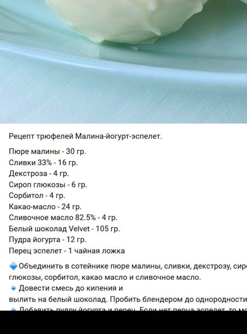 Тонкий аромат малиновой пастели перетекает в сладкий сон на тарелке снежной чистоты. Хрупкая белизна шоколада скрывает нежность йогурта, будто морозное утро в объятьях весеннего рассвета. Словно алхимия вкусов, рецепт превращает привычное в необычное — малину сливает с бархатными сливками, пока декстроза и сироп глюкозы привносят свою лунную нежность. Вкрапления перца эсепелет добавляют остроту, как некие заметки в дневнике. Этот трюфель — не просто десерт, это сюита изульты, где каждый ингредиент играет свою роль в симфонии. Любовь к экспериментам и утонченность мастерства создают в этом лакомстве ощущение путешествия в страну вкусовых чудес, где каждое прикосновение йогурта и шоколада становится моментом медленного удовольствия.