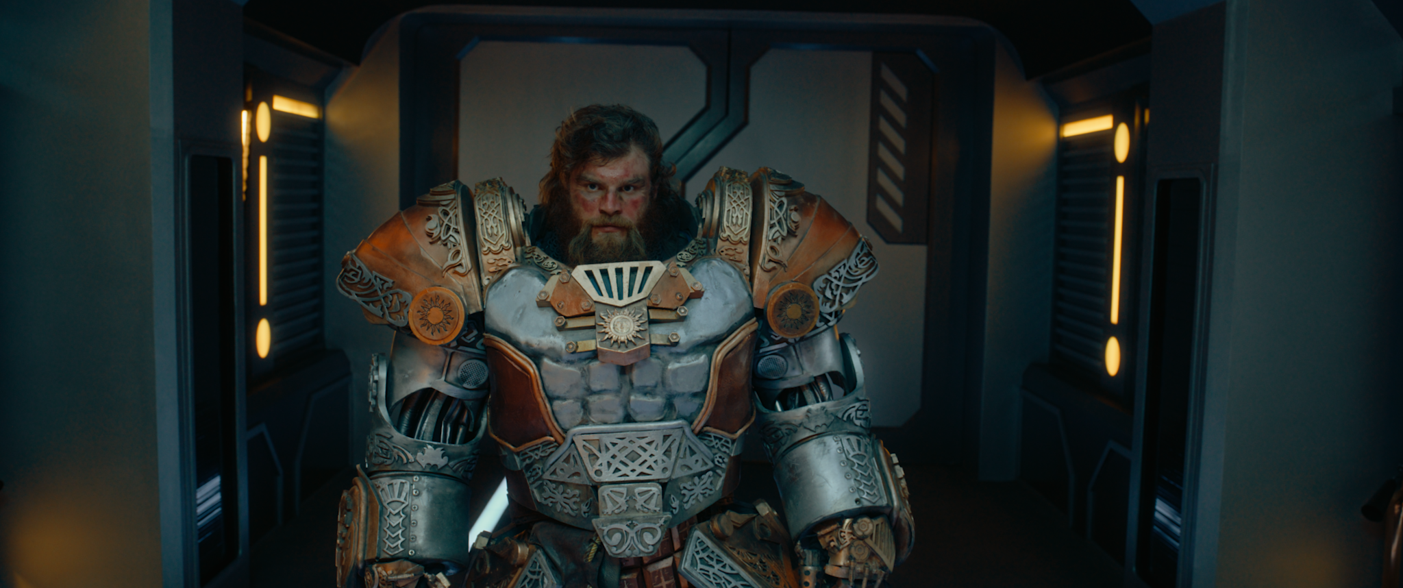В тёмной, почти космической пустоте коридора, словно артефакт древней цивилизации, вырисовывается величественная фигура, облачённая в доспехи, больше похожие на панцирь мифического титана. Этот воин, закованный в металл, кажется олицетворением времени, где технологии и легенды сплелись в единый клубок. Свет падает мягко, словно желая прощупать рельефы его наряда, состаренные вековыми ветрами истории и фантазий. Лицо воина, обрамлённое гривой волос, напоминает древнего скандинавского бога в поисках своего небесного трона. В этом молчаливом взгляде полноту вселенной рифмует с мимолётностью человеческой жизни. История произносится шёпотом: "Это дирижабль мечты и звёздные тропы". Неясные звуки чаруют атмосферу вокруг, как древний язык, понятный только придорожным камням и шумящим звёздам.