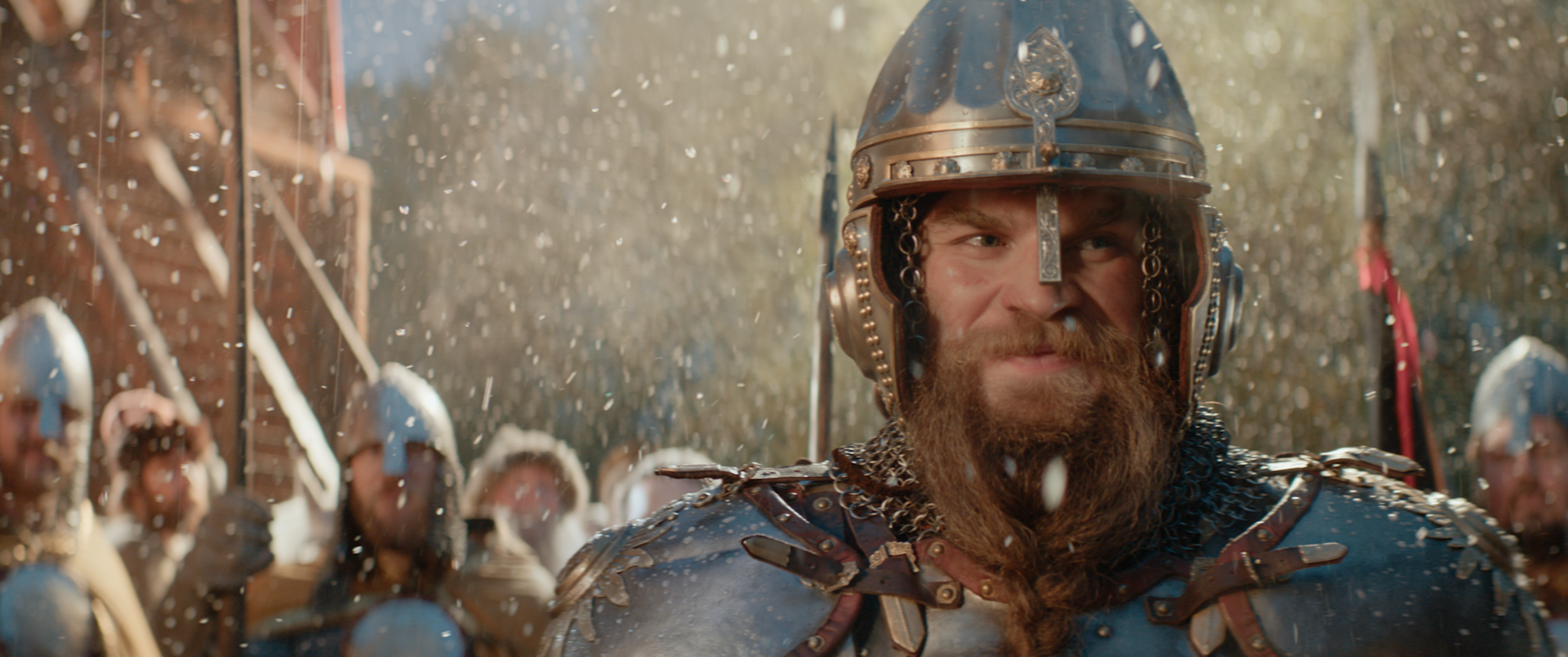 На мгновение время остановилось среди воинствующего гула мужества и стали. Герой, закованный в доспехи, выступает, как оживший эпос, взгляд его полон решимости и силы. Мельчайшие снежинки танцуют вокруг, словно приветствуя бесстрашного рыцаря, вышедшего на битву. За его спиной выстроились товарищи, каждый со своей историей, закрытой за стальной маской шлема. Светлая магия утреннего солнца отражается на латах, придавая сцене волшебство былых времен, где честь и отвага царят на полях сражений. Этот миг — напоминание о вечном противостоянии человека и судьбы, где только уверенная рука сможет вести за собой, ведь каждый из них следит за первым шагом лидера, готового броситься навстречу ветрам перемен.